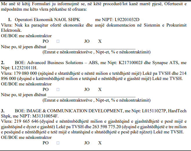 Më tej kompania “Advanced Business Solutions – ABS”, dhe “Synapse ATS” kanë bërë ofertën 214 896 000 Lekë me TVSH.