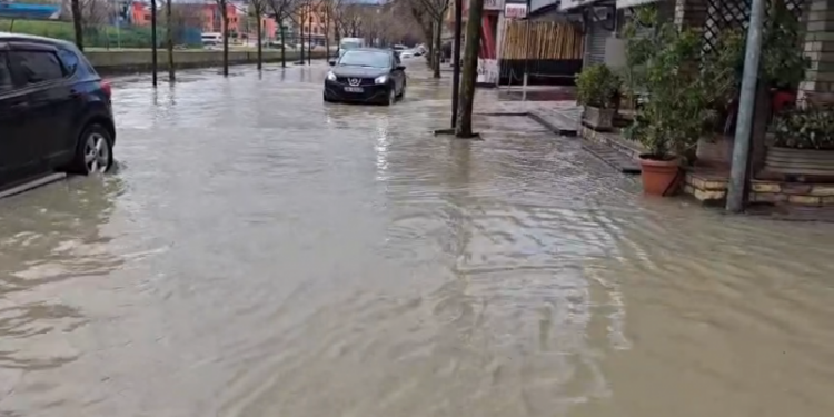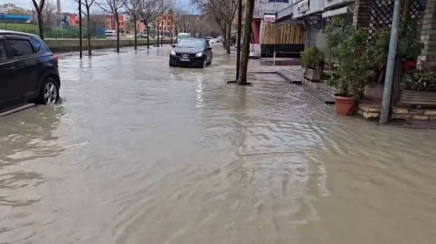 Pamjet nga terreni tregojnë ujë që ka mbuluar rrugët dhe trotuaret, duke krijuar rrezik për njerëzit dhe dëme materiale.