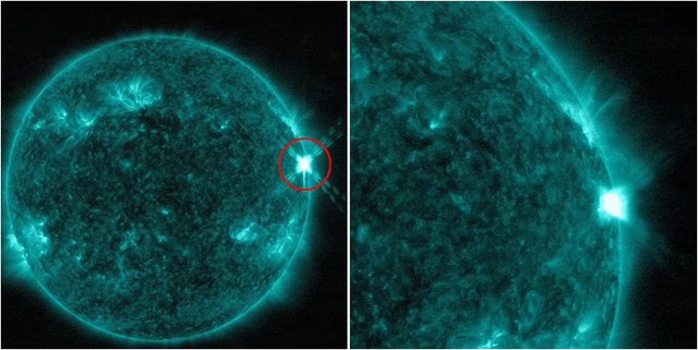 Observatori Dinamik Diellor i NASA-s kapi imazhin e shpërthimit në Diell, siç shihet në shkëlqimin intensiv në rajonin e sipërm djathtas të Diellit, i cili në thelb tregon një nëngrup të dritës ultravjollcë ekstreme dhe është me ngjyrë blu-jeshile.