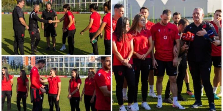 Dy Kombëtaret patën një takim shumë të ngrohtë e miqësor pasditen e sotme në ambientet e ‘Shtëpisë së Futbollit’. Kuqezinjtë u vizituan në stërvitjen e sotme nga disa prej vajzave të Kombëtares.