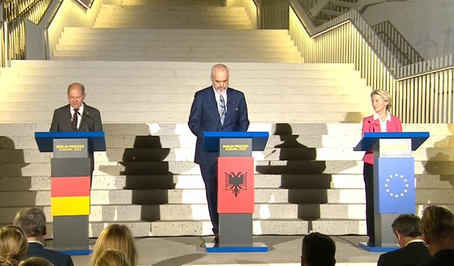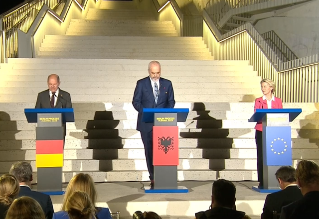 Këta dy gjermanë kanë orare, afate, kohë të caktuara, kështu që nuk dua të marr nga koha e tyre këtu. Sepse nuk ndodh çdo ditë të presim kancelarin gjerman dhe presidenten e Komisionit Europian”, tha Rama në fjalën e tij.