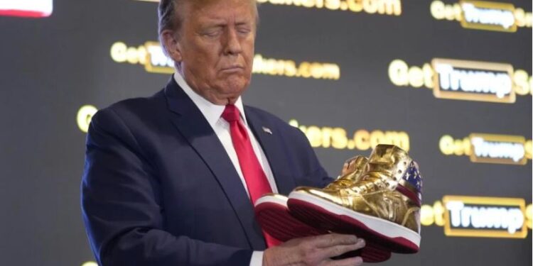 Ish-presidenti prezantoi “Trump Sneakers” në Sneaker Con në Filadelfia. Ai vendosi një palë atlete floriri, të cilat një faqe e re e internetit i ka renditur për 399 dollarë dhe i quajti “NEVER SURRENDER HIGH-TOP SNEAKER”, në podium ndërsa fliste, sipas CNN.