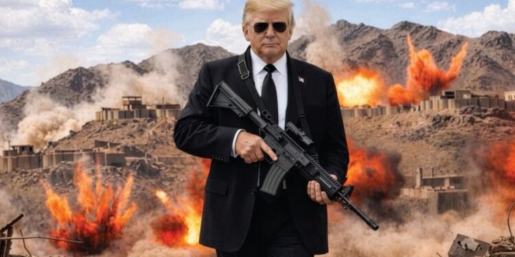 Në një reagim në Truth Social, presidenti i SHBA ka ndarë një foto të tij me një peisazh pas të një mali ku ndodhin shpërthime të fuqishme.