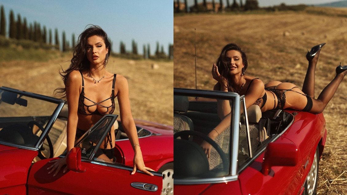 Ajo pozon me të brendshme të zeza tejet seksi me geta deri mbi gjunjë e me taka të zeza, mbi një makinë të kuqe, duke u dukur jashtëzakonisht tërheqëse.