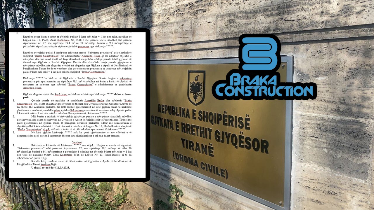 Gjykata e Durrësit, në vendimin e marrë pak ditë më parë konstaton se “gjatë gjykimit në themel të çështjes penale nga Braka dhe nga të pandehurit e mbrojtësit e tyre nuk është kërkuar që Gjykata të vendoste (shprehej) dhe lidhur me masën e sigurimit “Sekuestro preventive” të vendosur mbi pasurinë objekt 9 kate mbi tokë + 1 kat nën tokë të mësipërm dhe për këtë shkak në vendimin penal gjyqësor nuk është vendosur për masën e sekuestros preventive të mësipërme të vendosur mbi objektin pallat ndërtimi 9 kate mbi tokë + 1 kat nën tokë që ndodhet në Lagjen Nr. 13, Plazh-Durrës e ndërtuar nga shoqëria “Braka Construksion” me administrator të pandehurin Amarildo Braka”.