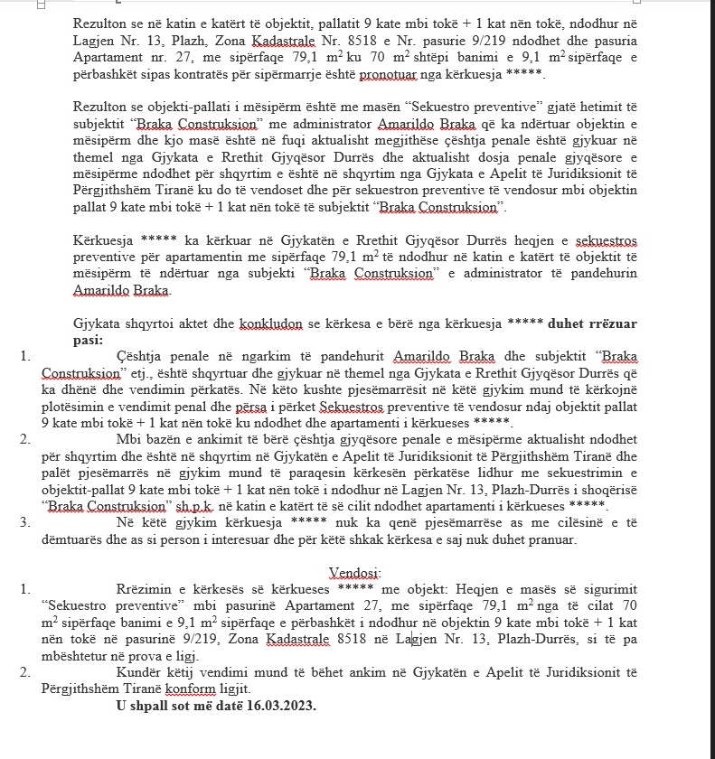 Kërkuesja ka kërkuar në Gjykatën e Rrethit Gjyqësor Durrës heqjen e sekuestros preventive për apartamentin me sipërfaqe 79,1 m2 të ndodhur në katin e katërt të objektit të mësipërm të ndërtuar nga subjekti “Braka Construksion” e administrator të pandehurin Amarildo Braka.