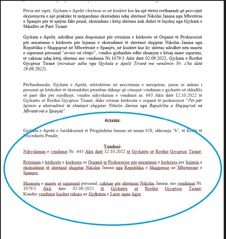 Mbi bazën e ankimit të bërë çështja gjyqësore e mësipërme është dërguar për gjykim (shqyrtim) në Gjykatën e Apelit dhe bashkë me dosjen gjyqësore ndodhen aktet hetimore të Prokurorisë përfshirë dhe Vendimi penal të Gjykatës së Rrethit Gjyqësor Durrës që ka vendosur masën e sekuestros preventive mbi objektin, pallatin e mësipërm.