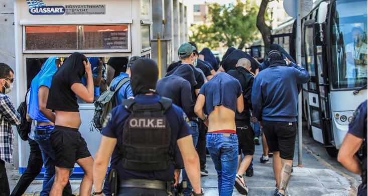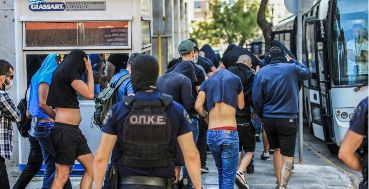 Të rinjtë e arrestuar – shumica e të cilëve e mbuluan kokën me fanellat e tyre për ta fshehur identitetin – dolën para gjykatësit një ditë pasi një tifoz 29-vjeçar grek u ther me thikë për vdekje pranë stadiumit të AEK-ut të Athinës, duke e shkaktuar anulimin e ndeshjes kualifikuese mes klubit grek dhe Dinamo Zagrebit në Ligën e Kampionëve.