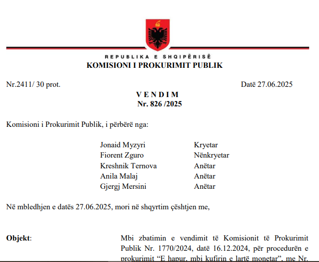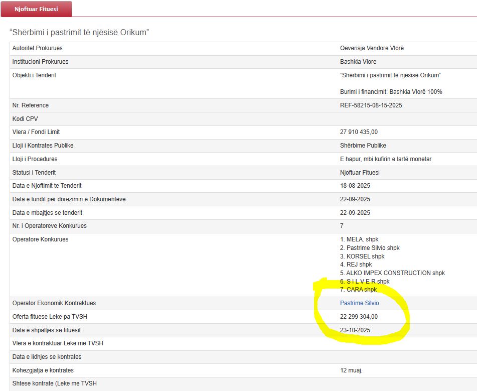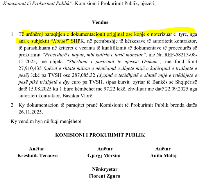 Më konkretisht, masa bllokuese ishte vendosur nga KPP më 3 shkurt 2026, me objekt “Shërbimi i pastrimit të njësisë Orikum” me fond limit 27,910,435.00 lekë pa TVSH ose 287,085.32 euro pa TVSH.