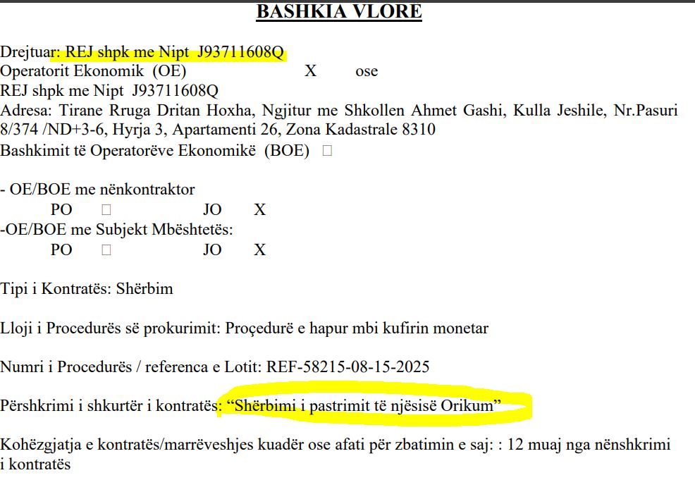 Vetëm një javë pasi ishte ulur në kolltukun e kryetarit të bashkisë, në datën 22.09.2025, bashkia ka zhvilluar procedurën e prokurimit. Bëhet fjalë për tenderin me objekt “Shërbimi i pastrimit të njësisë Orikum”, me fond limit 27,910,435 lekë pa TVSH. Në datën 10.10.2025, bashkia ka njoftuar operatorët ekonomikë pjesëmarrës mbi rezultatet e vlerësimit të Komisionit të Vlerësimit të Ofertave.