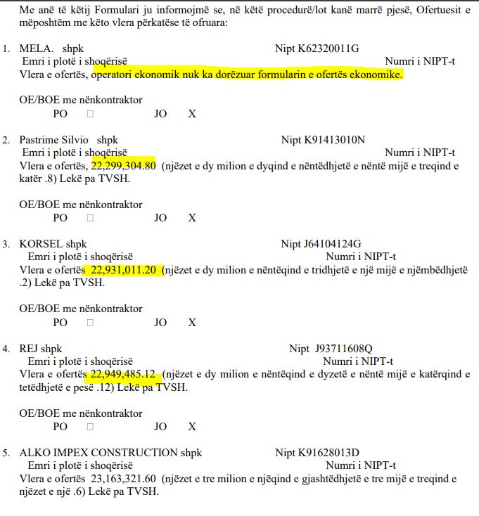Dhe kështu, nën presionin e KPP, Bashkia Vlorë nuk ka marrë në konsideratë ofertat më të ulëta. Kompania së cilës iu dha kontrata. “REJ shpk” ka ofertën 230 milionë lekë (22,949,485.12 Lekë pa TVSH).