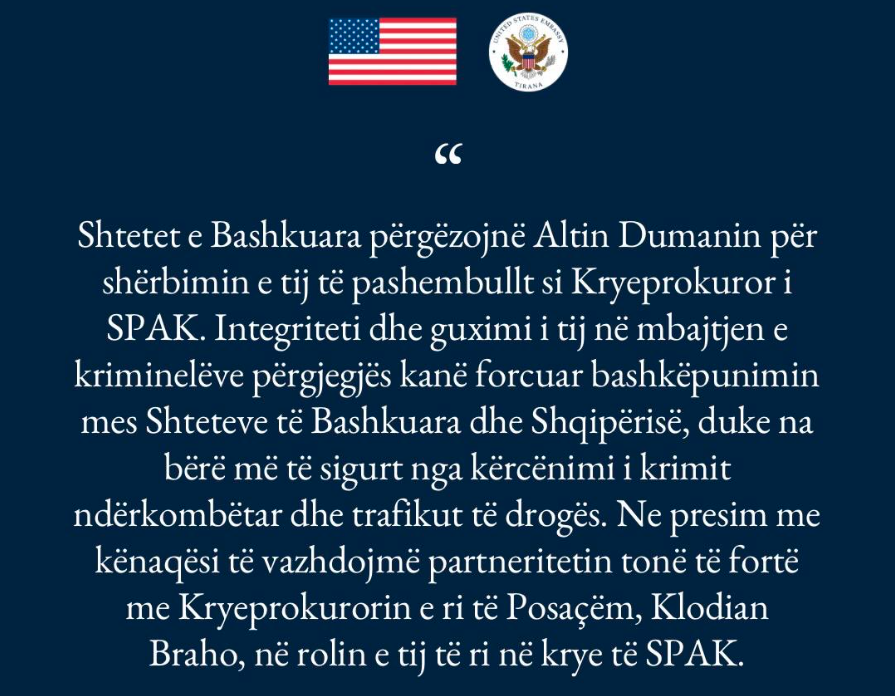 Pas zgjedhjes së kreut të ri të SPAK, Shtetet e Bashkuara përgëzojnë Altin Dumanin për shërbimin e tij të pashembullt si Kryeprokuror i SPAK.