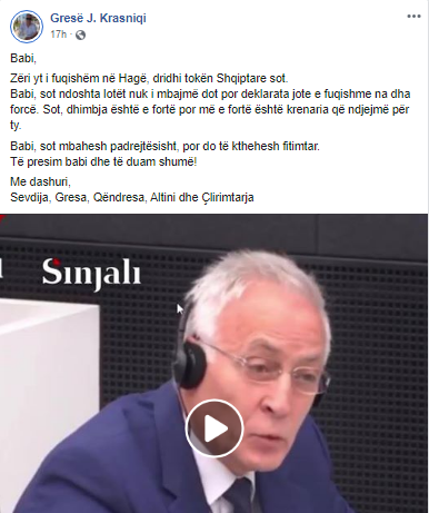 Vajza e tij Gresa ka bërë një postim prekës pas paraqitjes së parë të babait të saj para Tribunalit Special, ku shkruan se ai do të kthehet fitimtar në tokën shqiptare.