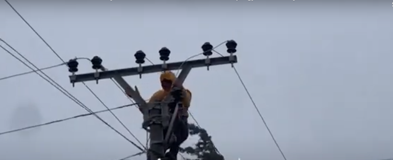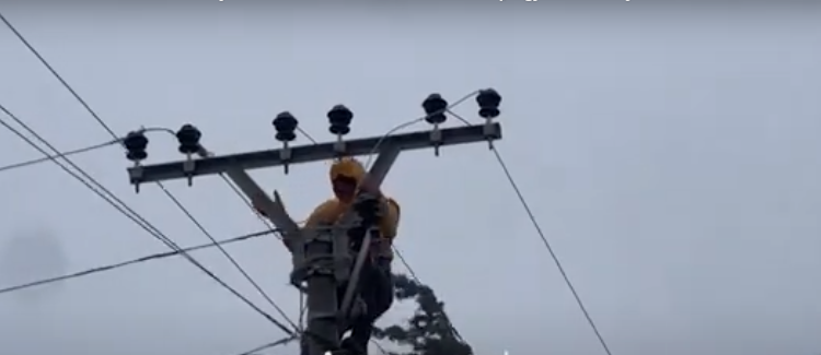 Një nga punonjësit e OSSHEE është ngjitur në shtyllën elektrike për të bërë riparimet, duke “sfiduar” kushtet e vështira atmosferike.
