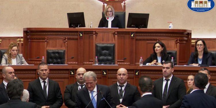 Teksa fliste në foltoren e Kuvendit Berisha rrethohet nga deputetët e PD, mbështetës të tij ndërkohë që garda u afrua pranë tyre për të shmangur ndonjë incident.