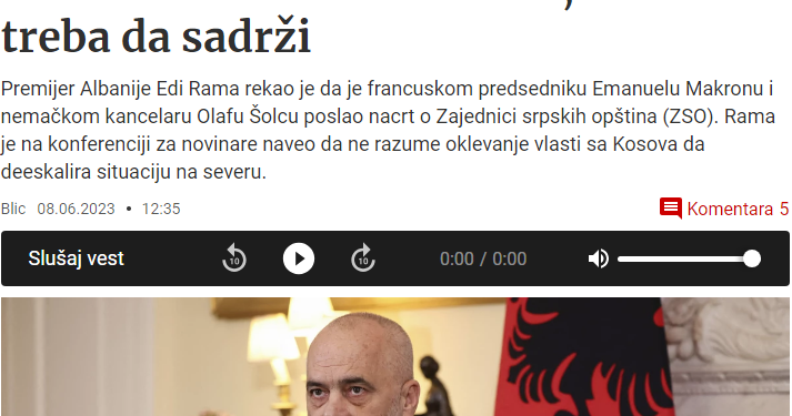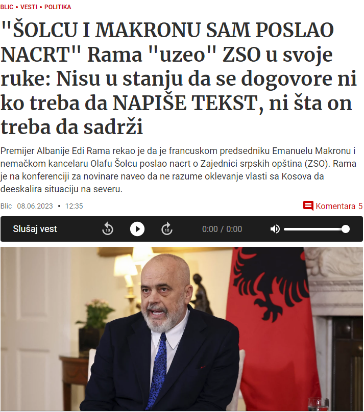 Gjatë shkrimit citohen fjalët e Ramës, i cili deklaroi se prej kohësh është në djeni që nyja gordiane e dialogut do të jetë Komuniteti i Komunave me shumicë serbe. Sipas kryeministrit të Shqipërisë palët nuk mund të bien dakord se kush duhet ta shkruajë këtë tekst dhe as çfarë duhet të përmbajë teksti.