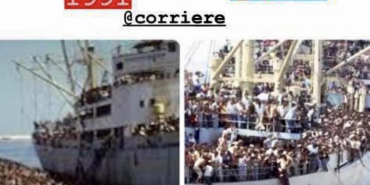La Republika: Një meme me foton e anijes Vlora e 8 gushtit 1991, me dyzet mijë shqiptarët që zbarkuan në Bari, dhe pranë saj, i njëjti imazh i shndërruar: turistët italianë që zbarkojnë në Shqipëri.