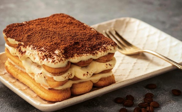 Biskotat Savoiardi i lyejmë me kafe ekspres dhe i vendosim mbi shtresën e kremit. E përsërisim këtë veprim disa herë. Kjo është receta klasike e tiramisusë. Sipas dëshirës, në mes mund të vendosim feta luleshtrydhe ose copa çokollate. Në fund, e spërkasim me kakao dhe e zbukurojmë me luleshtrydhe.