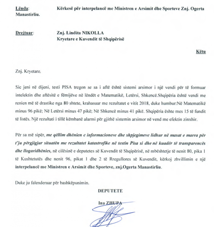 “Shqipëria është mes 15 të fundit të listës. Një rezultat i tillë duhet të jetë kambanë alarmi për të gjithë sistemin arsimor në vend me efektin zinxhir. Me qëllim dhënien e informacioneve dhe shpjegimeve lidhur me masat e marra për t’iu përgjigjur situatës me rezultatet katastrofike në testin Pisa si dhe në kuadër të transparencës dhe llogaridhënies, në cilësinë e deputetes së Kuvendit të Shqipërisë, në mbështetje të nenit 80, pika 1 të Kushtetutës dhe nenit 96, pikat I dhe 2 te Rregullores së Kuvendit, kërkoj zhvillimin e një interpelance me ministren e Arsimit dhe Sporteve, Ogerta Manastirliu”, thuhet në shkresën e depozituar në Kuvend nga deputetja Zhupa.