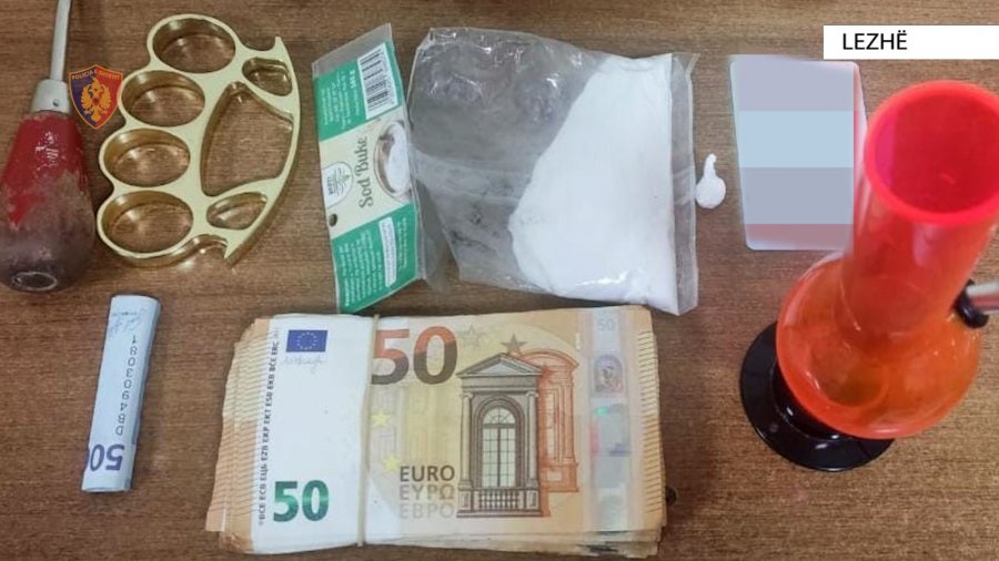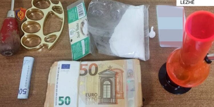 Një 33 vjeçar u arrestua në qytetin e Lezhës pasi gjatë një kontrolli fizik iu gjetën rreth 80 gramë kokainë, mjet për konsumimin e lëndës, armë e ftohtë (përforcues grushti), thikë, kaçavidë, si dhe 3500 euro.