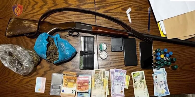 “Blutë” kanë sekuestruar lëndë narkotike kokainë e cannabis, armë gjahu, radio marrëse-dhënëse, armë të ftohta si dhe vlera monetare të dyshuara të përftuara nga shitja e lëndëve narkotike.
