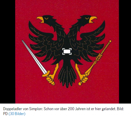Fotografia tregon kutinë e ndalimit të komunës Simplon. Në te shihet një një stemë me një shqiponjë dykrenare, në një sfond të kuq lartë, e vendosur në mes dhe e pagabueshme. Ngjashmëria me flamurin e Shqipërisë është e mahnitshme.