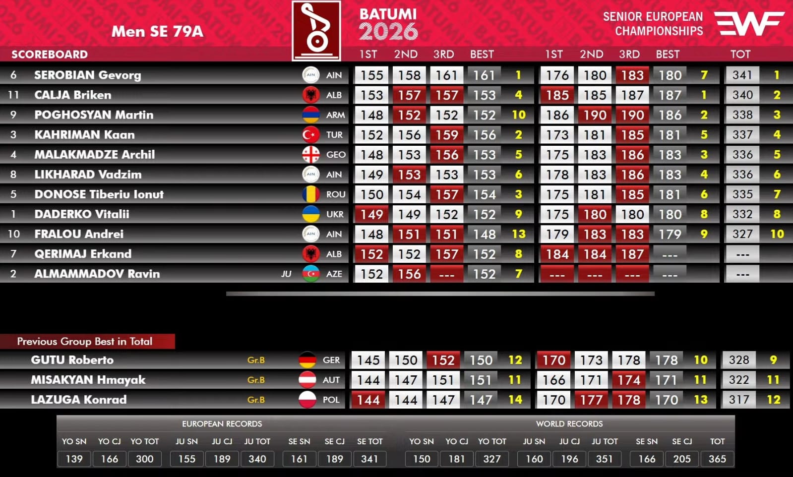 Është vërtet e dhimbshme të shohësh se si organizatorët dhe gjyqtaria në Batumi trajtojnë dy ikona si Calja dhe Qerimaj. Brikeni, 36 vjeç dhe Erkandi, 37 vjeç, po bëjnë sakrificën e fundit në prag të tërheqjes nga sporti. Në këtë moshë, çdo kilogram i ngritur peshon sa një jetë e tërë stërvitjeje, dhimbjesh dhe privimesh. Nëse ajo provë e Erkandit do të quhej e rregullt, siç ishte në të vërtetë, ai do të renditej në vendin e tretë në stilin e shtytjes, duke marrë medaljen e bronztë, dhe në vendin e pestë në dygarësh.