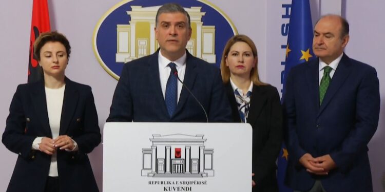 Kreu i Grupit Parlamentar të PD Gazment Bardhi, Kryetarja e Komisionit për të Drejtat e Njeriut Jorida Tabaku dhe deputeti...