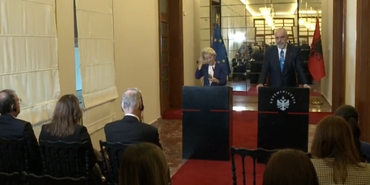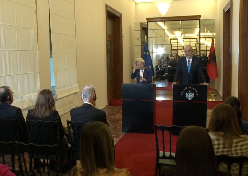 Kryeministri Edi Rama dhe Presidentja e Komisionit Europian, Ursula Von der Leyen, u pyetën në konferencën e përbashkët për mediat, në vigjilje të Samitit të Procesit të Berlinit, nëse do të trajtohej edhe çështja e tensioneve mes Serbisë dhe Kosovës.