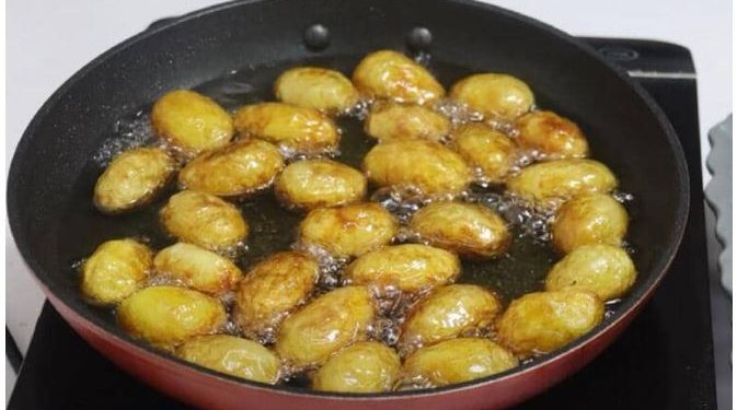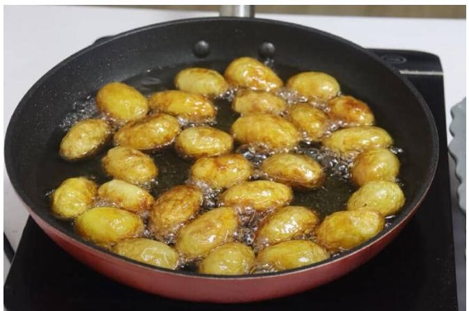 Skuqini patatet në një tigan në vaj që nuk është ngrohur më parë.