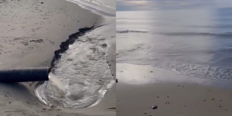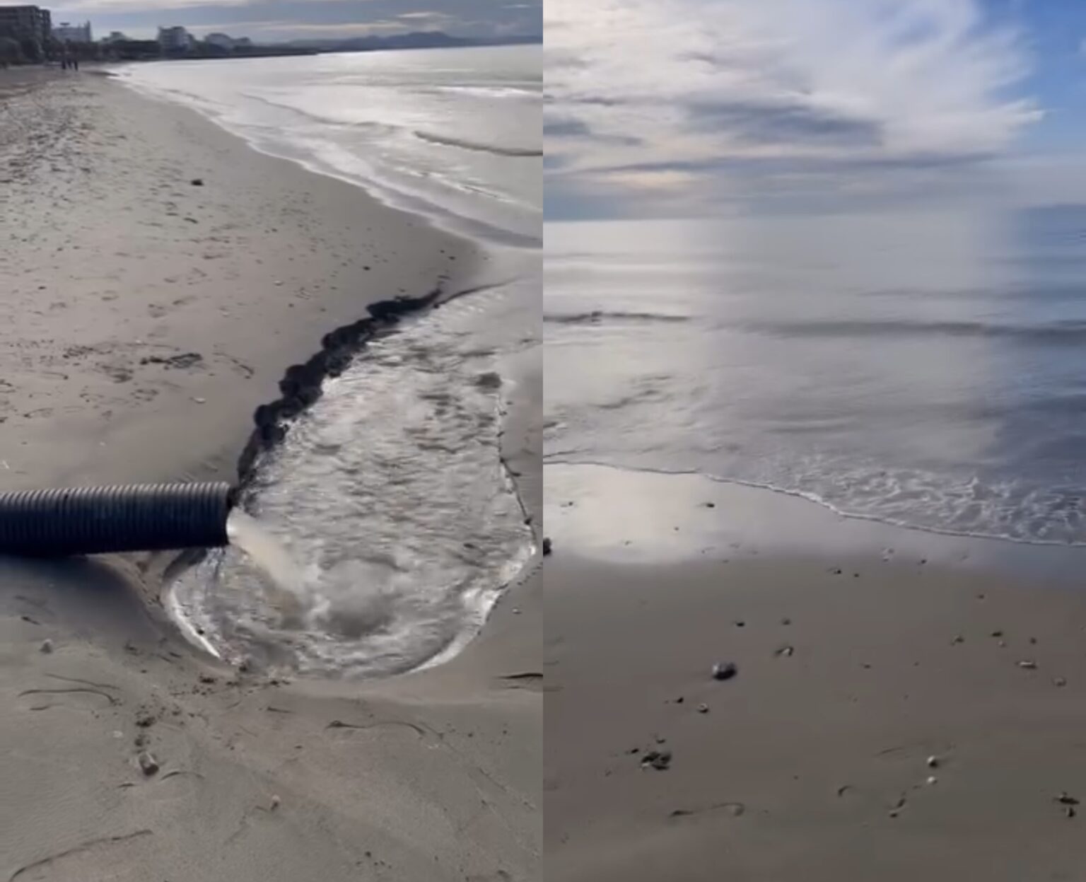 Pamjet e siguruara së fundmi tregojnë qartë praninë e ujërave të ndotura në vijën bregdetare, ku pushuesit detyrohen të kalojnë mes tyre. Në rërën pranë detit dallohet një tub shkarkimi, i cili derdh ujëra të zeza direkt në Adriatik, vetëm pak metra larg zonave ku lahen turistët.