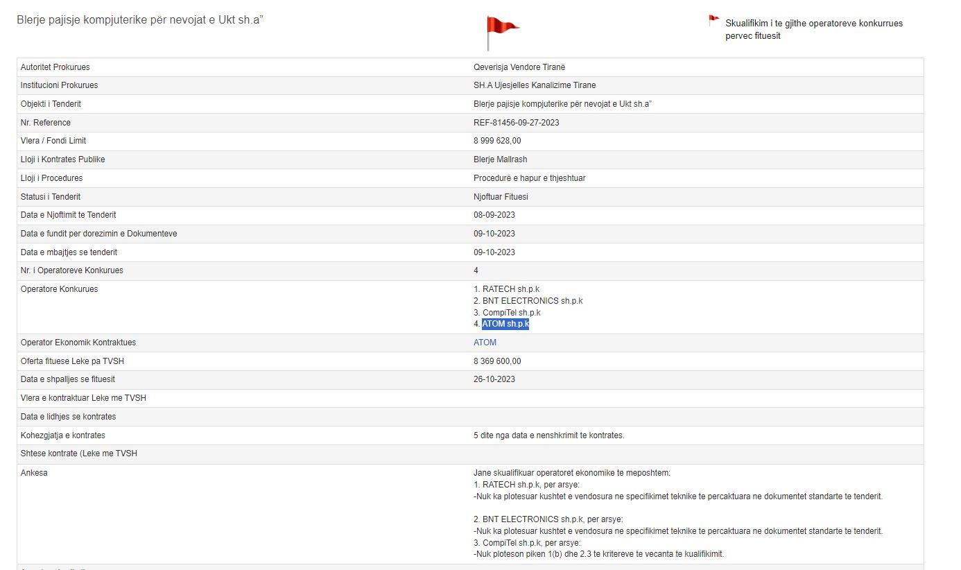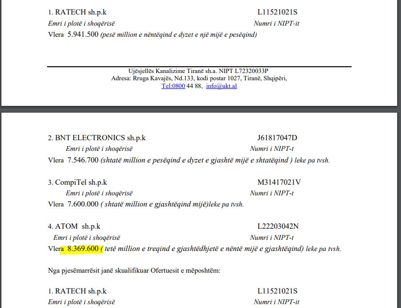 Sipas të dhënave të publikuara për këtë tender, janë paraqitur me oferta 4 kompani, por drejtori veproi ashtu siç ka mësuar nga praktikat e Erion Veliajt. Ai i dha fitoren ofertës më të shtrenjtë. Më saktë, ia dhuroi këtë kontratë, duke përjashtuar përnjëherësh ofertat e tjera më të lira. Kështu mbeti mbi tryezë vetëm zarfi i kompanisë ATOM sh.p.k.