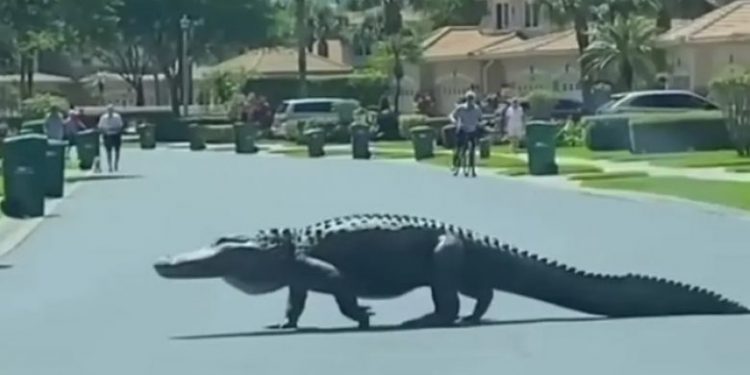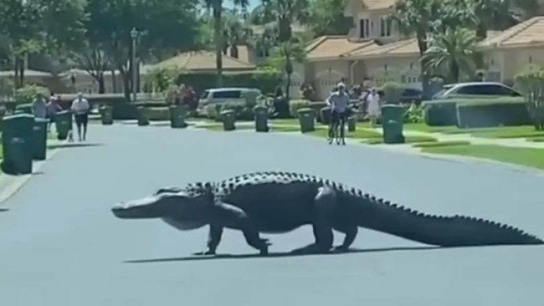 Një video mahnitëse kapi një aligator gjigant që po kalonte nëpër një lagje ku jetojnë banorë të pasur në Florida.