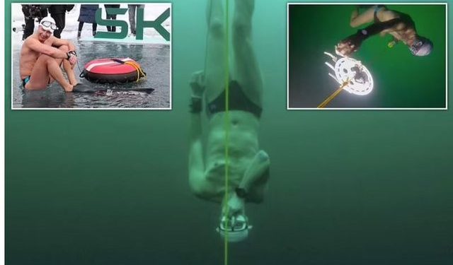 Pa një kostum noti, zhytësi 40-vjeçar mori një frymë të vetme përpara se të zhytej nëpër një vrimë të shpuar në akull për të nxjerrë një ngjitës nga një thellësi prej 50 metrash për të vërtetuar veprën e tij përpara se të dilte sërish nga e njëjta vrimë.