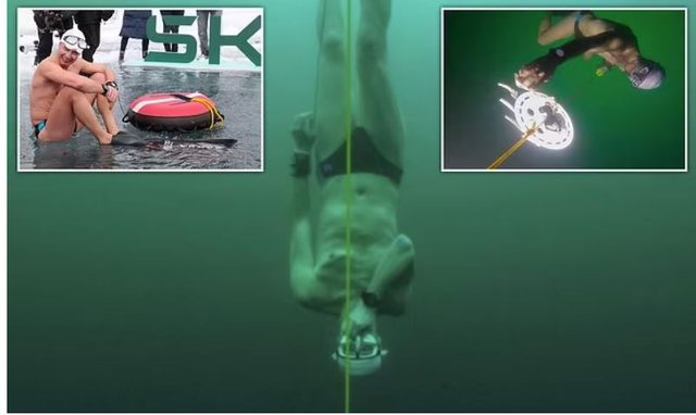 Pa një kostum noti, zhytësi 40-vjeçar mori një frymë të vetme përpara se të zhytej nëpër një vrimë të shpuar në akull për të nxjerrë një ngjitës nga një thellësi prej 50 metrash për të vërtetuar veprën e tij përpara se të dilte sërish nga e njëjta vrimë.