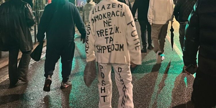 Një formë e pazakontë proteste ka tërhequr vëmendjen mbrëmjen e sotme ku një qytetar është shfaqur i veshur tërësisht me të bardha, duke përcjellë mesazhe të forta politike përmes mbishkrimeve në veshje.