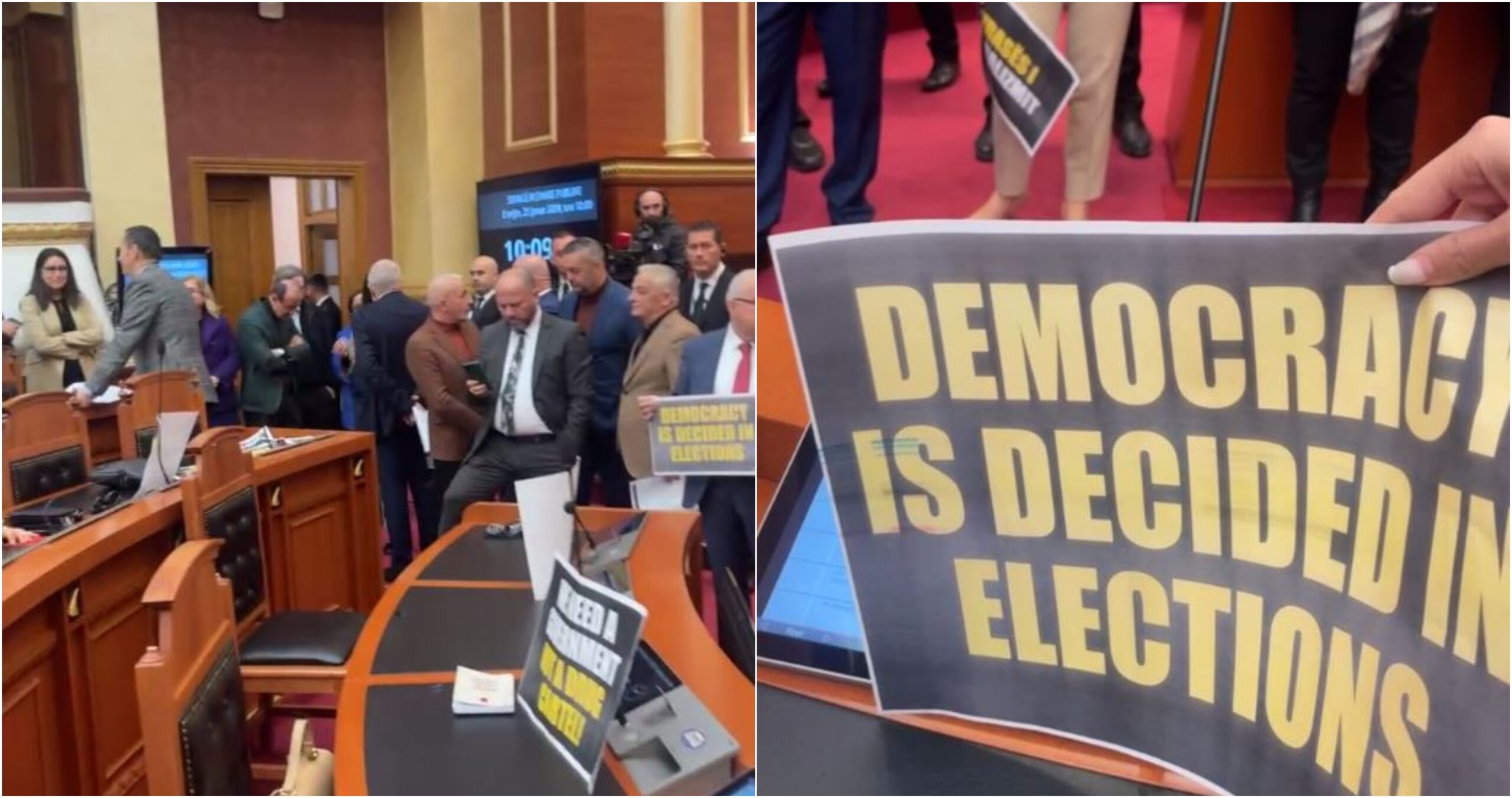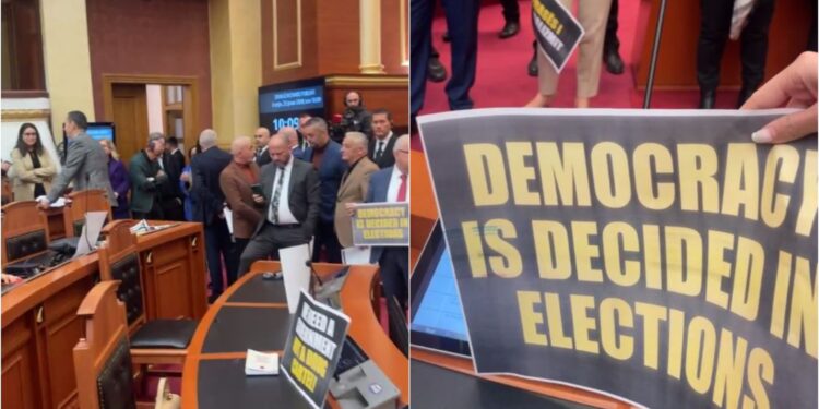 Të gjithë deputetët e aksionit opozitar janë rreshtuar dhe në duar mbajnë pankarta me mesazhe të ndryshme.