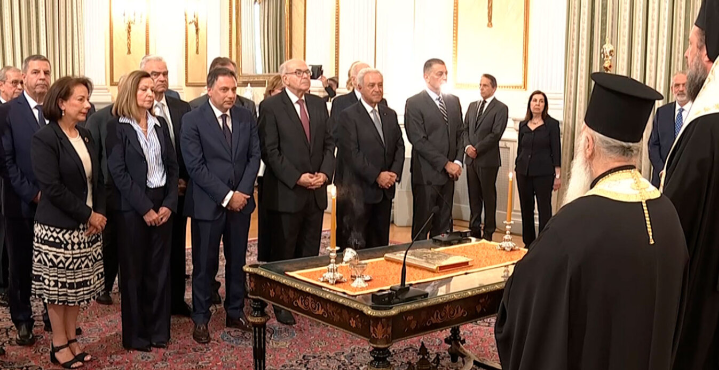 Ioannis Sarmas u zotua dje për besnikëri ndaj Kushtetutës përpara Katerina Sakellaropoulou, në dhomën e kredencialeve në Pallatin Presidencial. Kryepeshkopi Hieronymos u betua në Kryeministri.